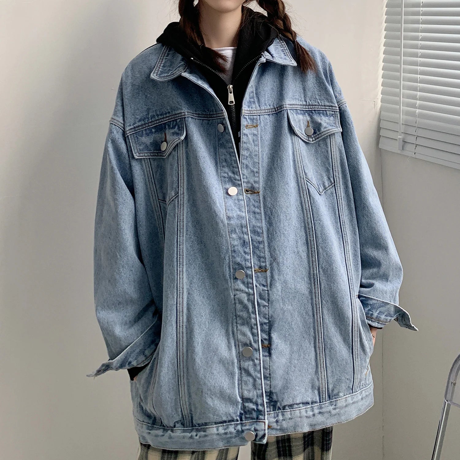 Mėlyna oversize džinsinė striukė su kišenėmis