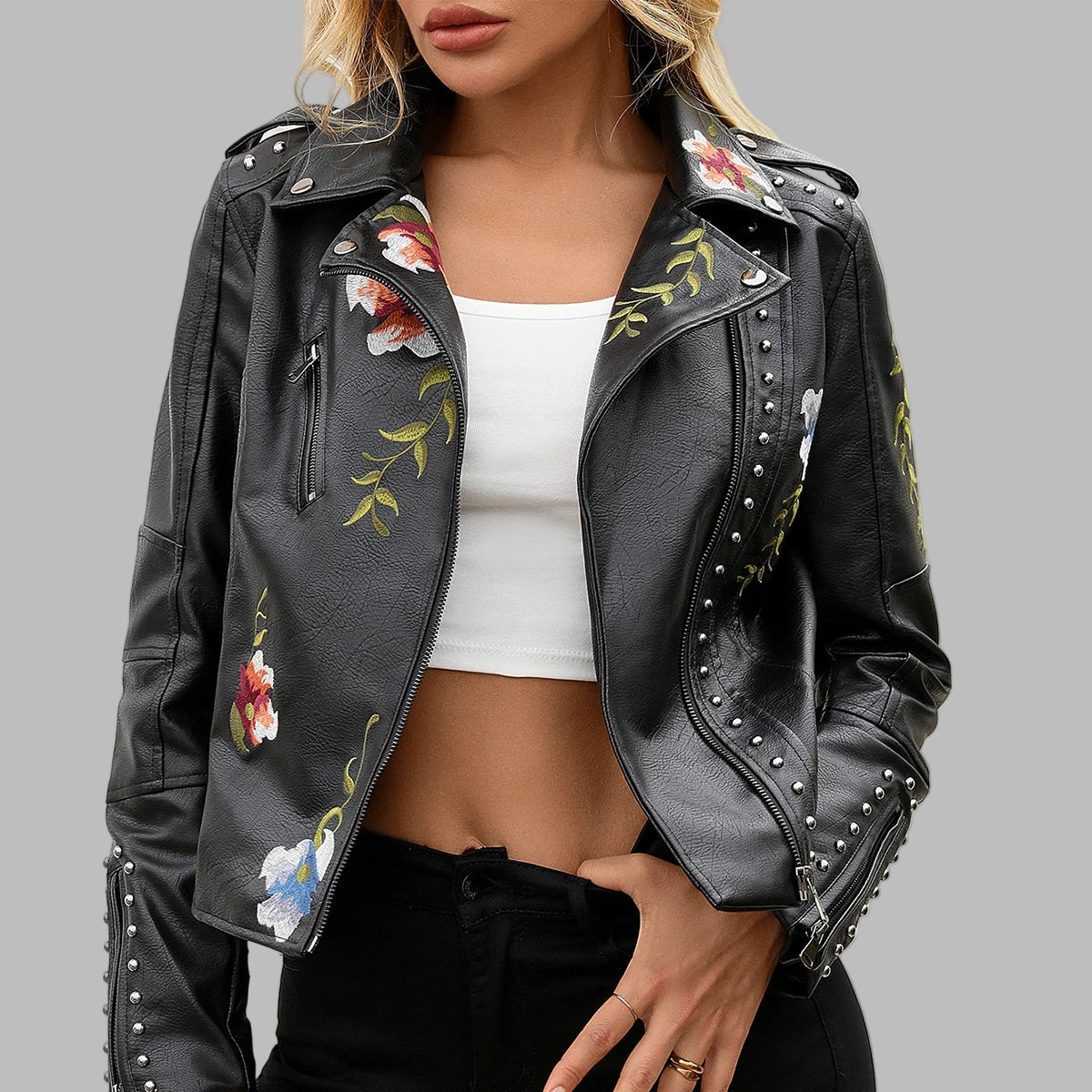 Moteriška juoda odinė gotikinė striukė su kniedėmis ir gėlių siuvinėjimais