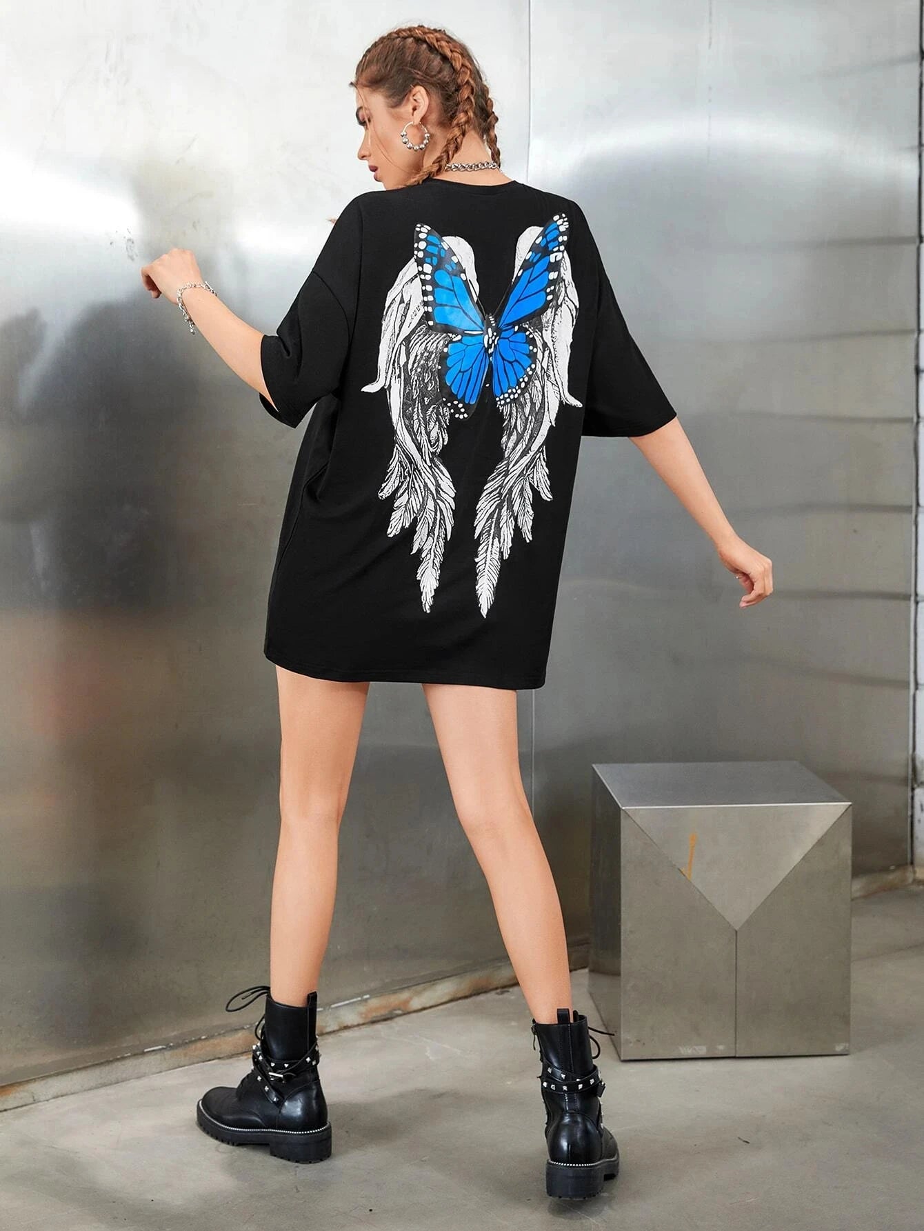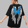 Moteriški mėlyni gotikinio roko stiliaus marškiniai su drugelio sparnais, oversize
