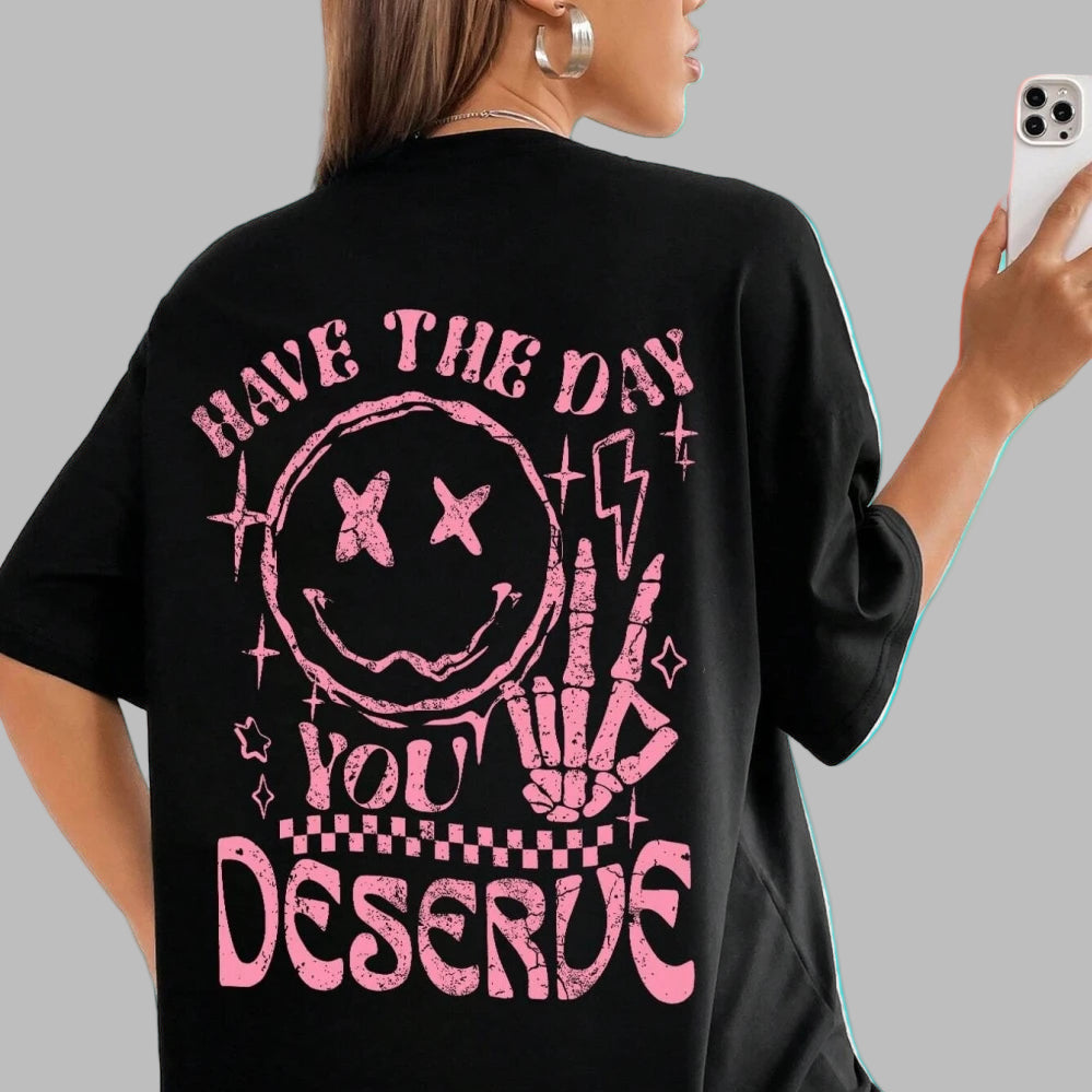 Moteriški oversize marškinėliai su grunge rock stiliaus rožiniu smiley atspaudu