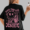 Moteriški oversize marškinėliai su rožiniu grunge rock smiley atspaudu
