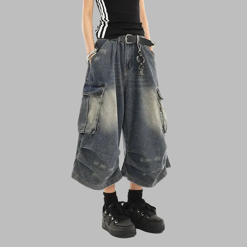 Moteriškos plačios grunge stiliaus džinsinės cargo šortai