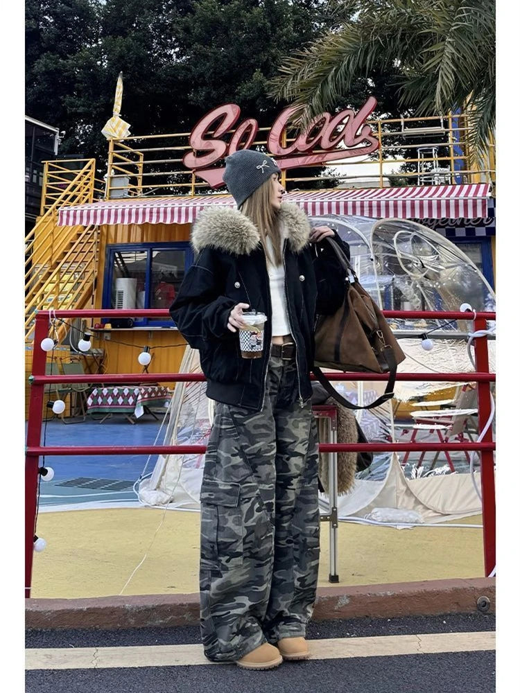 Moteriškos militarinės cargo kelnės su kišenėmis, oversize