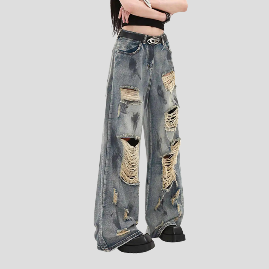 Moteriškos plačios grunge stiliaus džinsinės kelnės su skylėmis