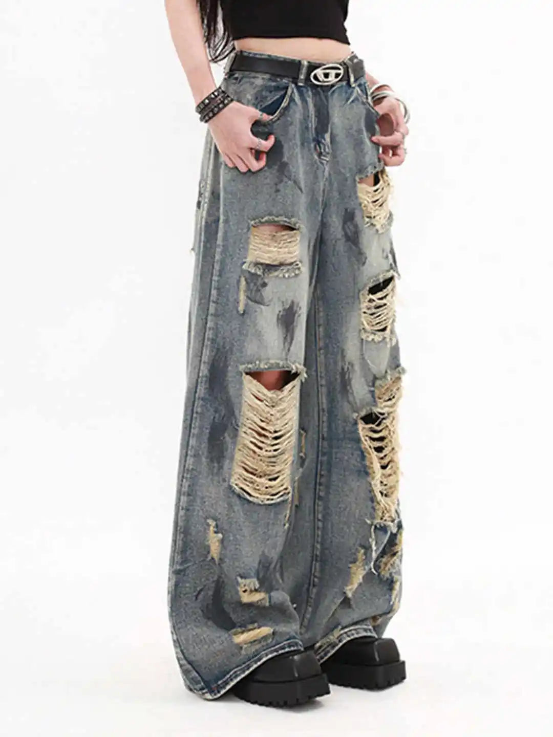 Spodnie Jeansowe Poszarpane Dziury Szerokie Damskie Grunge