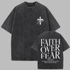 Oversize grunge stiliaus marškinėliai su kryžiumi ir užrašu "Faith Over Fear"