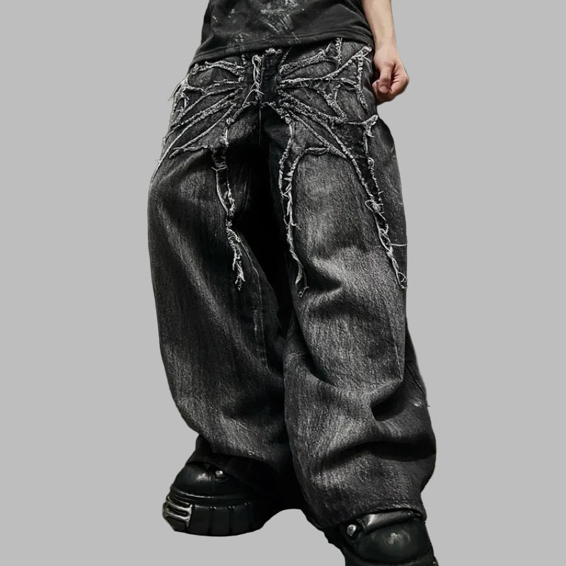 Pilki džinsiniai kelnės su grandinėmis, suplėšytos, laisvo kirpimo, unisex, punk stiliaus.