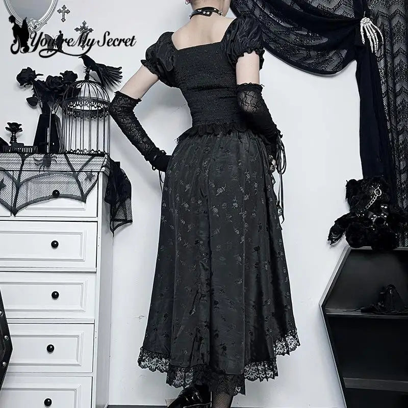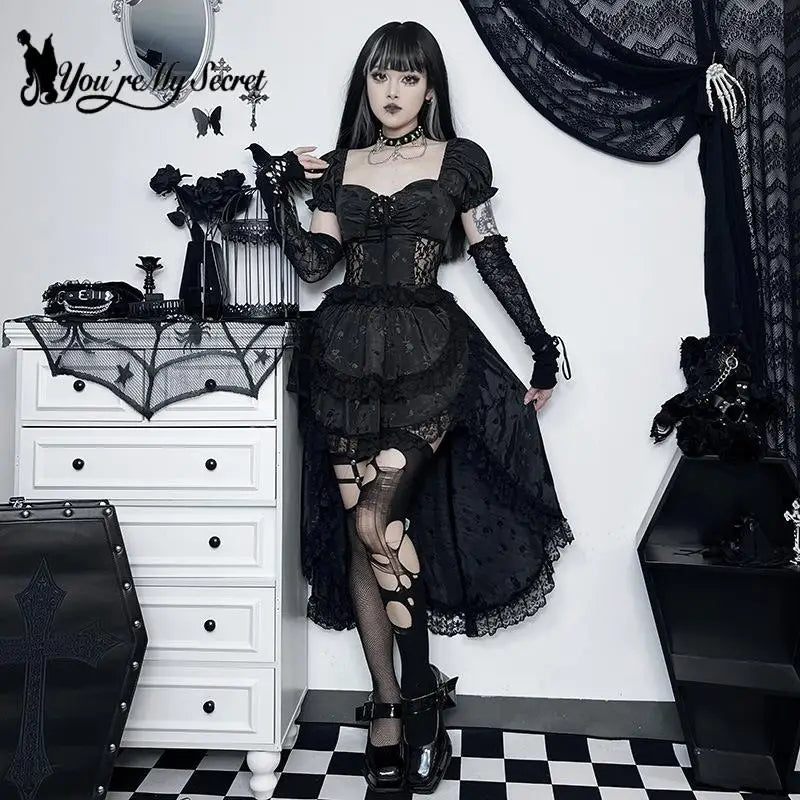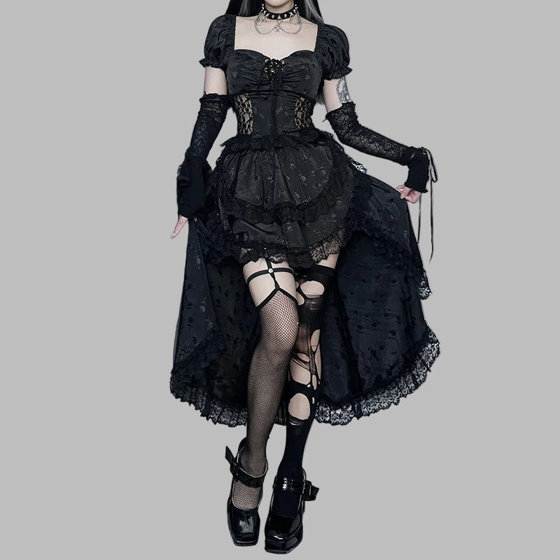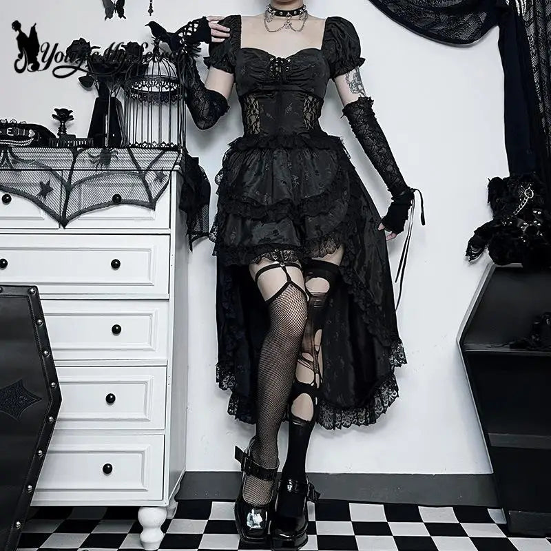 Punk gotikinė juoda asimetriška nėriniuota suknelė