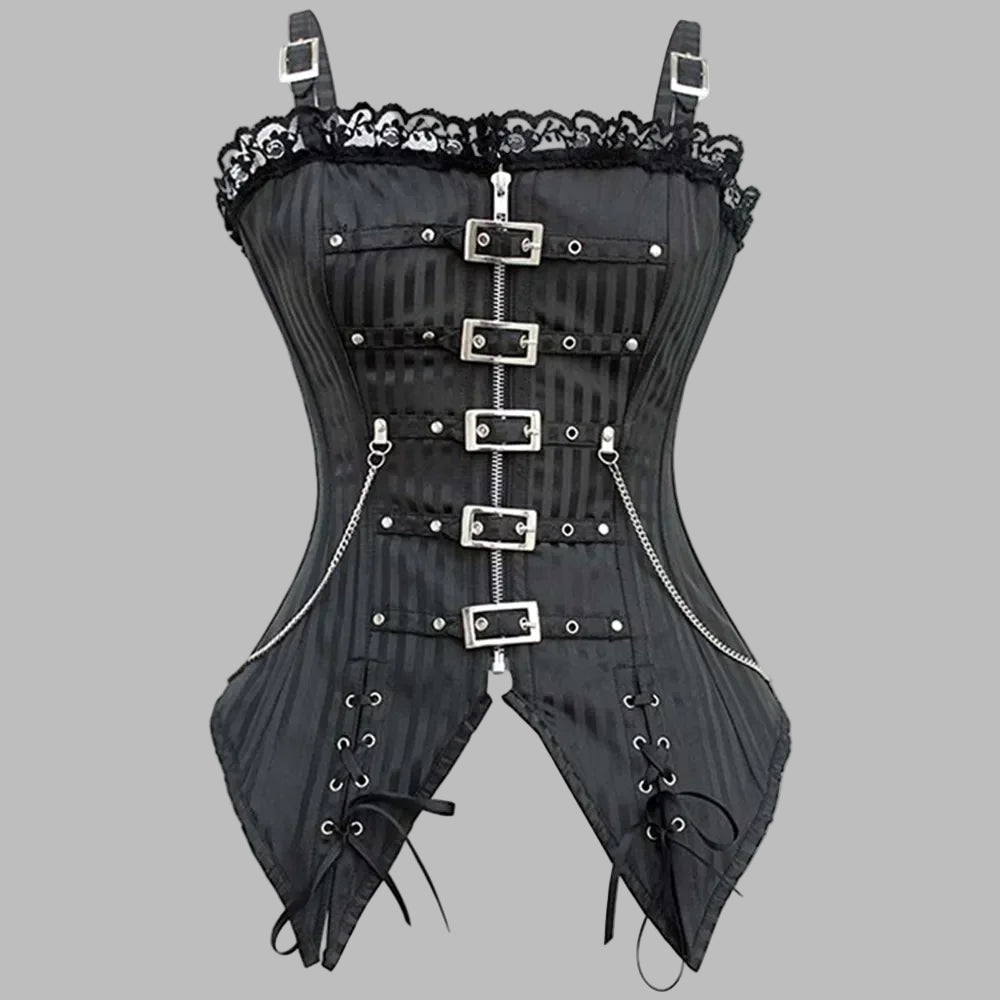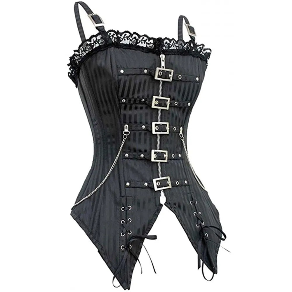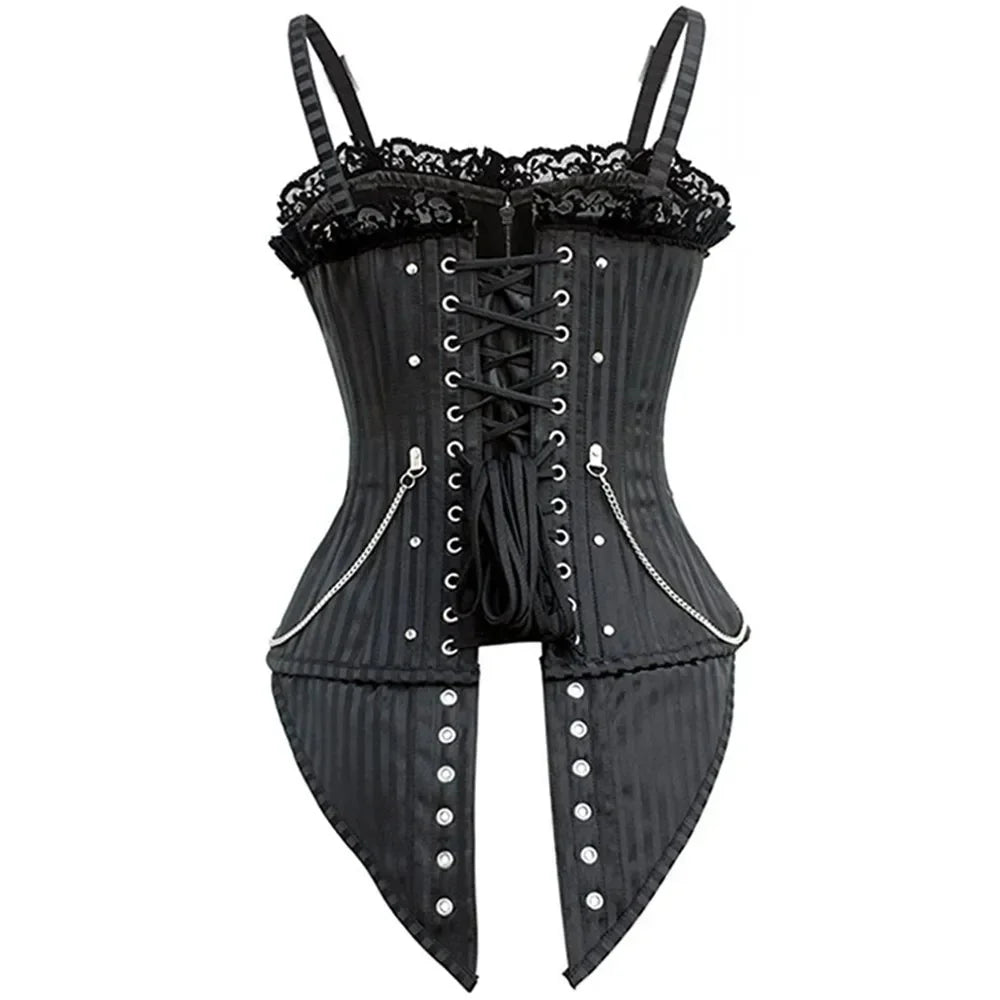 Punk gotikinis korsetas su sagtimis, kniedėmis ir grandinėmis, juodas dryžuotas