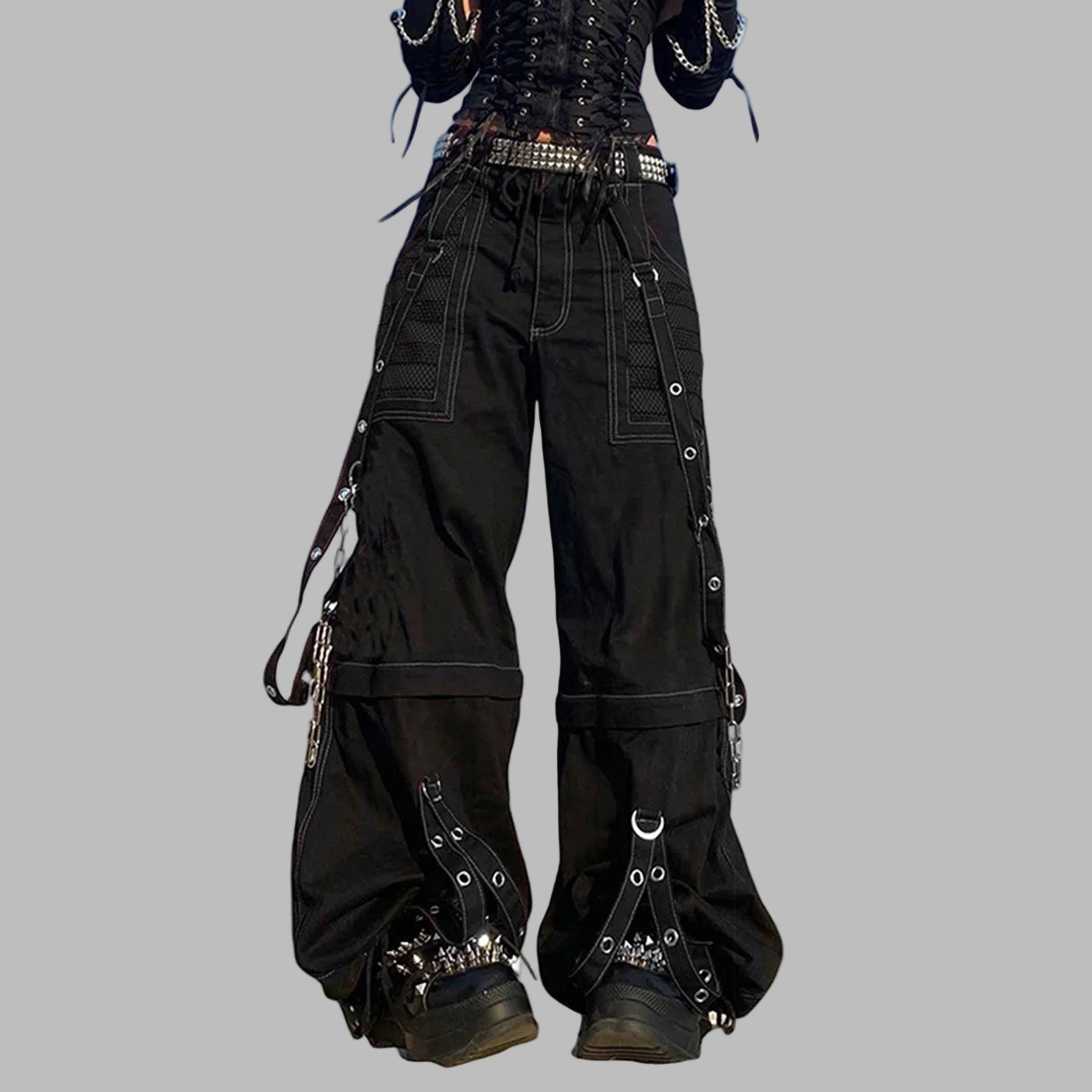 Punk Metal juodos kelnės cargo su grandinėmis ir kniedėmis Peržiūrėti parinktis