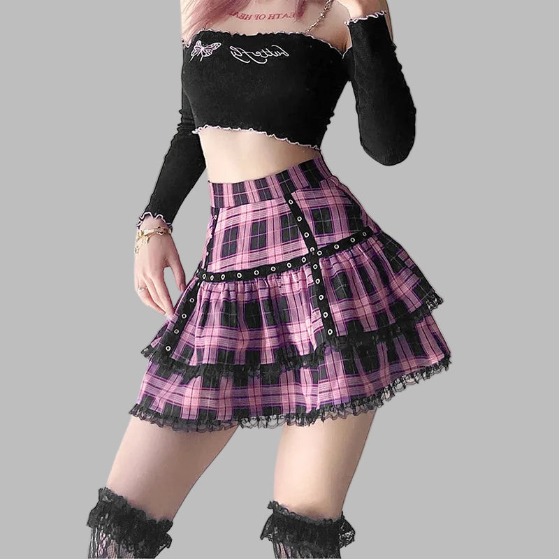 Punk Rock Grunge languota sijonas su nėrinių apdaila