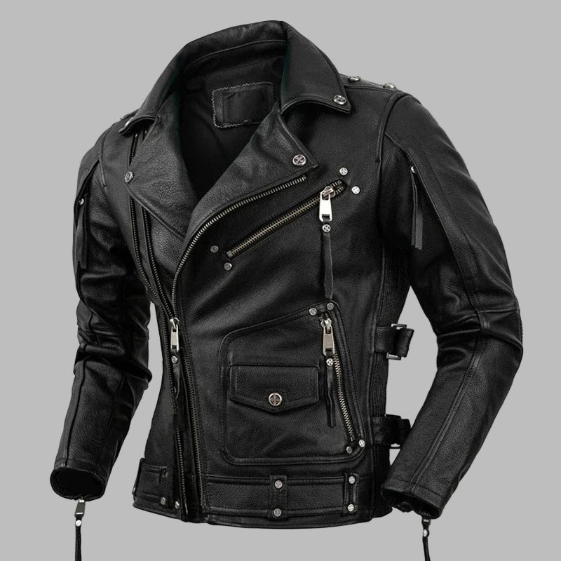 Juoda odinė punk rock stiliaus striukė su metalinėmis detalėmis