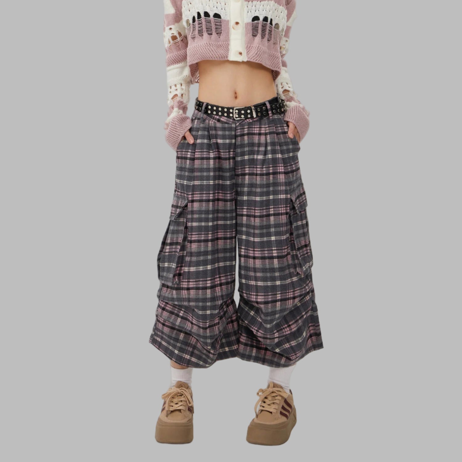 Punk Rock pilkos ir rožinės spalvos languotos kelnės su nėriniais