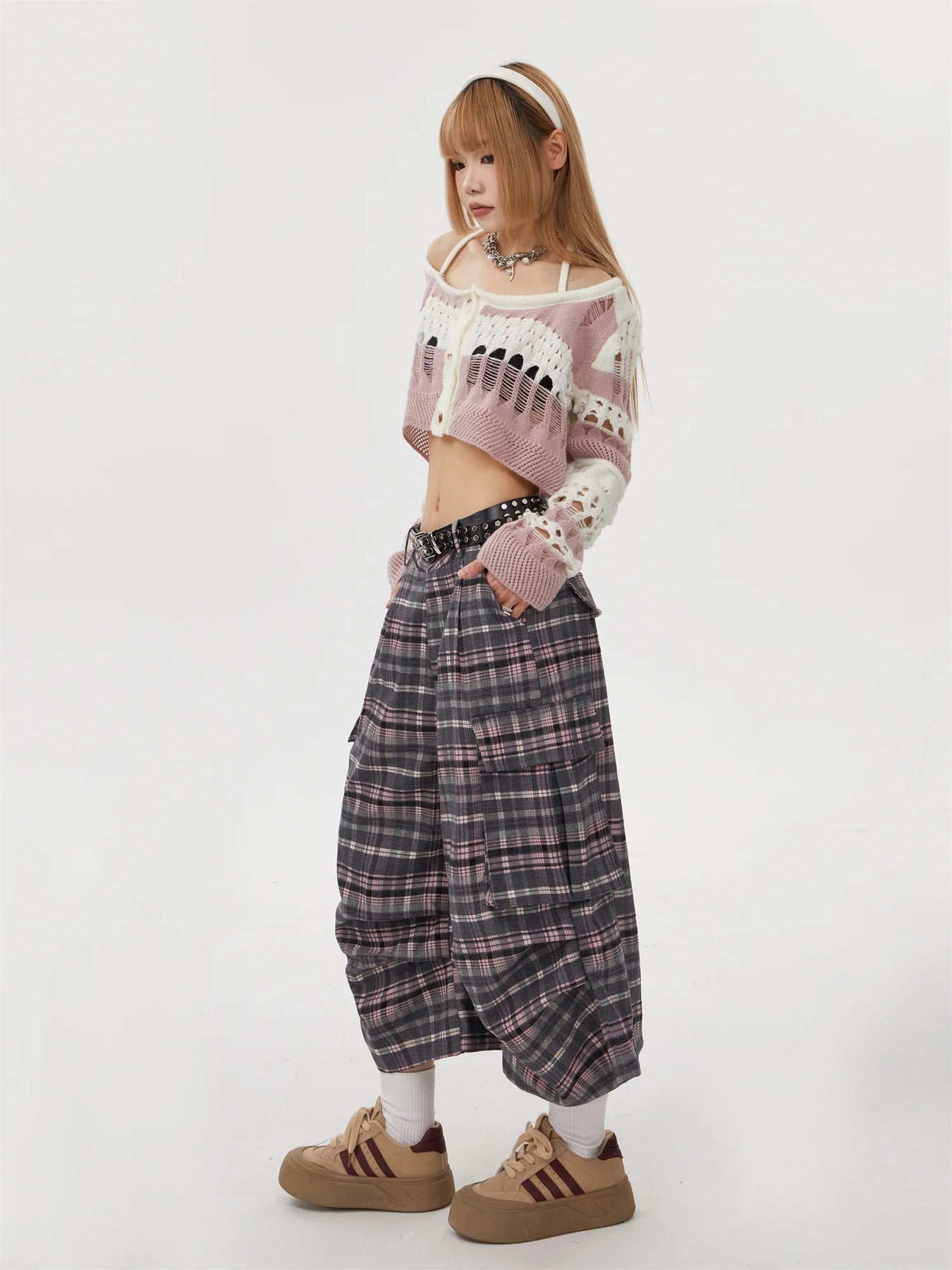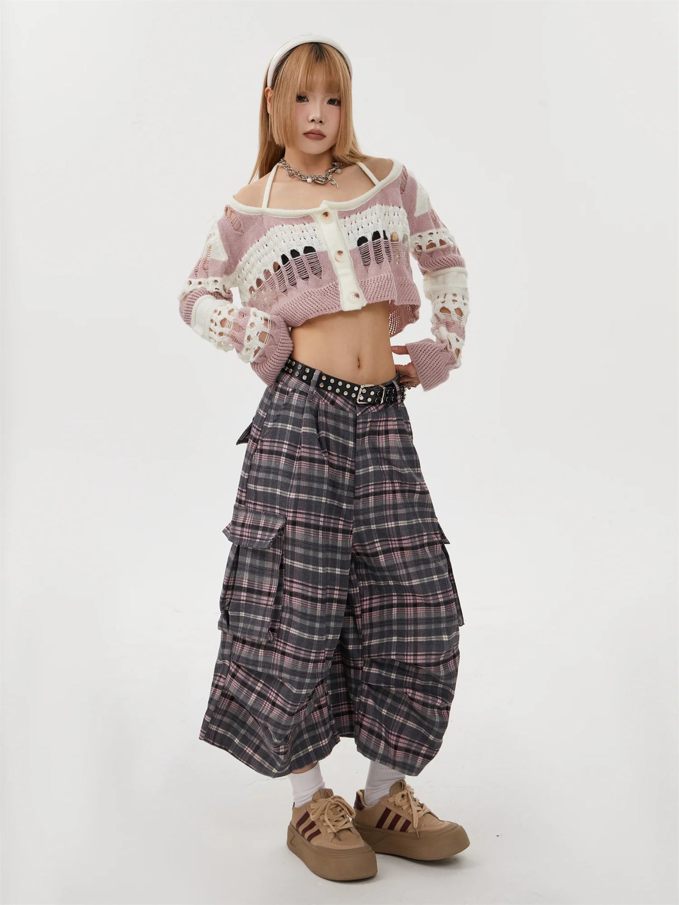Punk Rock Pilkos ir Rožinės Languotos Kelnės su Nėriniais