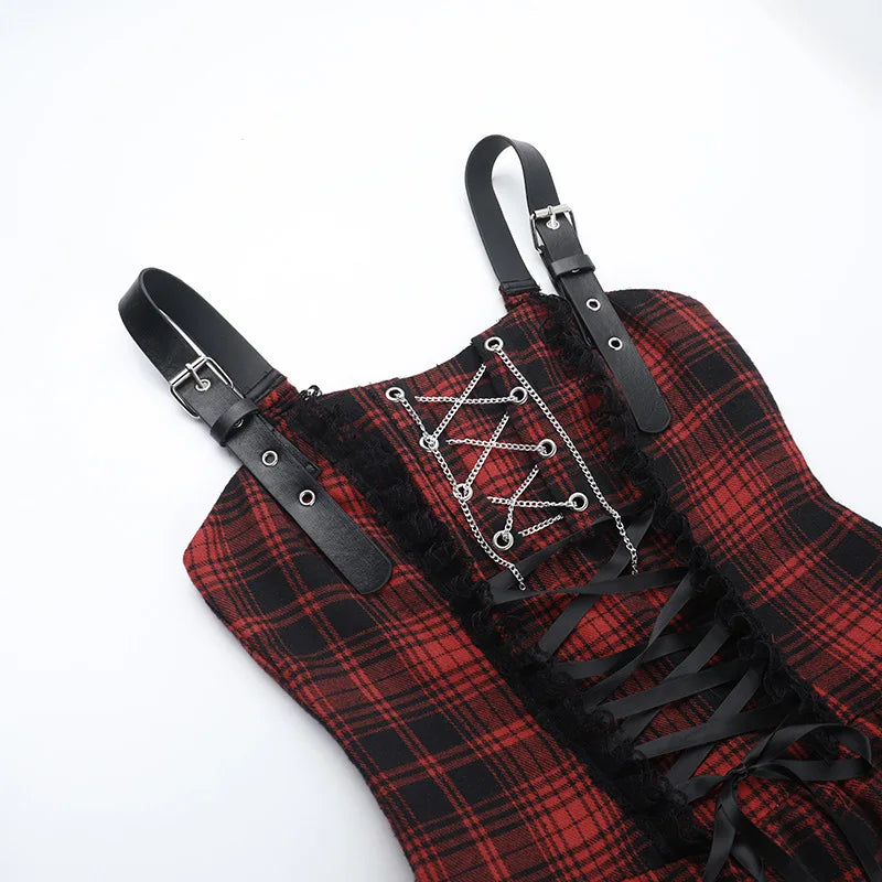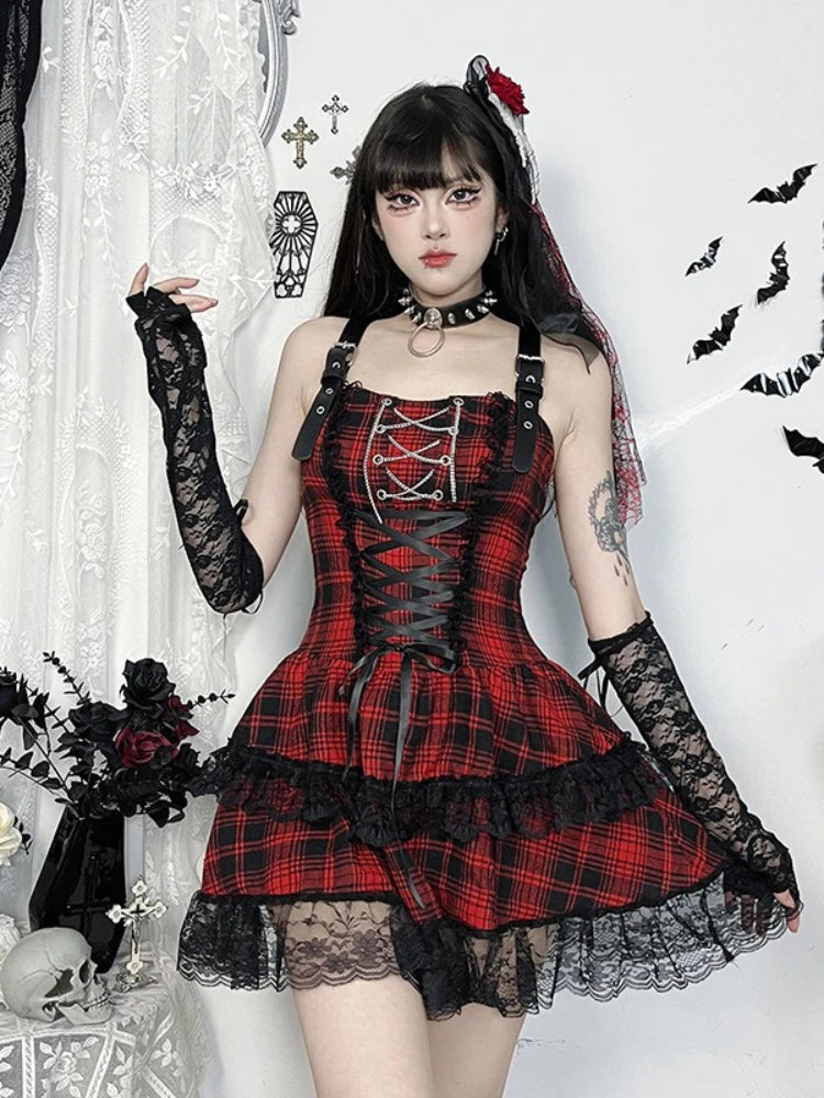 Raudona punk stiliaus suknelė su grandinėlėmis ir nėriniais