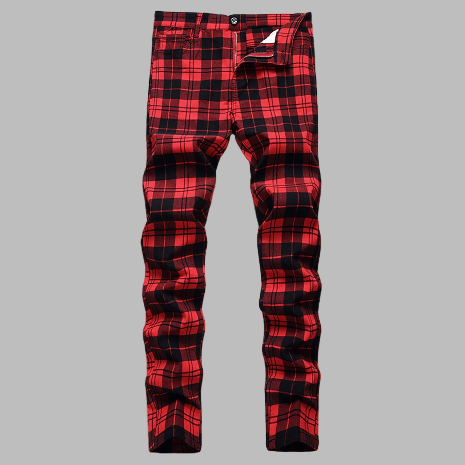 Metalinės raudonai juodos languotos roko stiliaus vintage kelnės 4XL