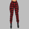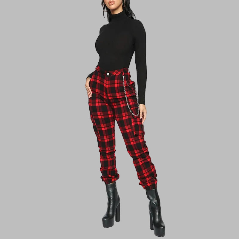 Raudonai juodi languoti prigludę punk stiliaus kelnės su grandine