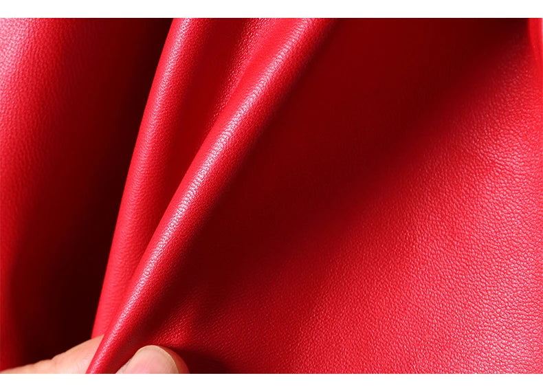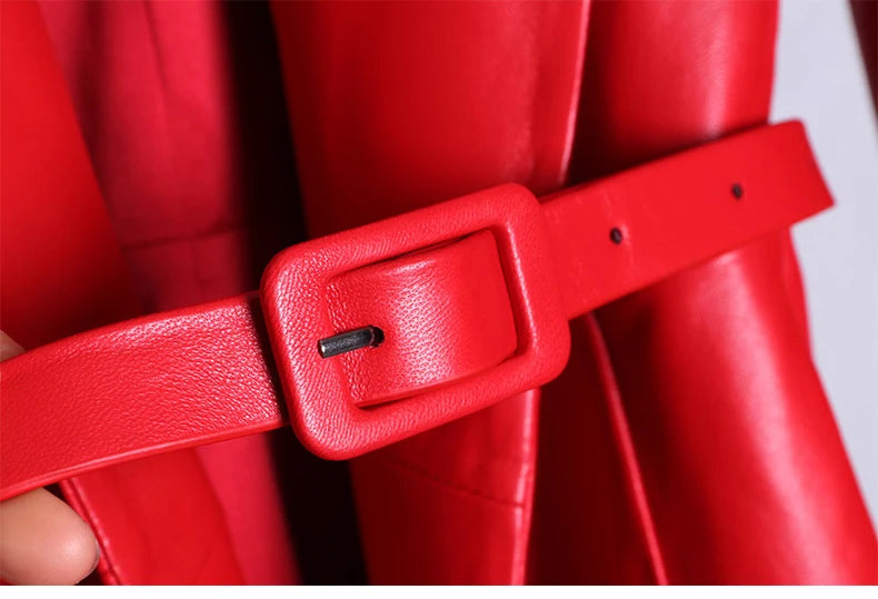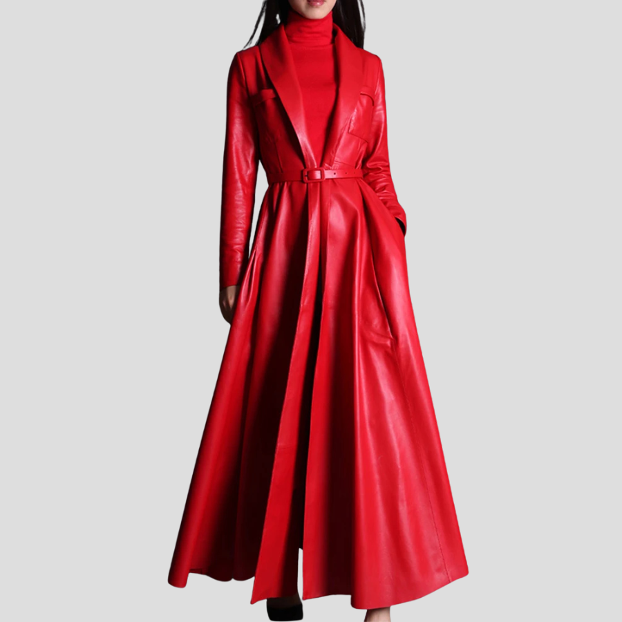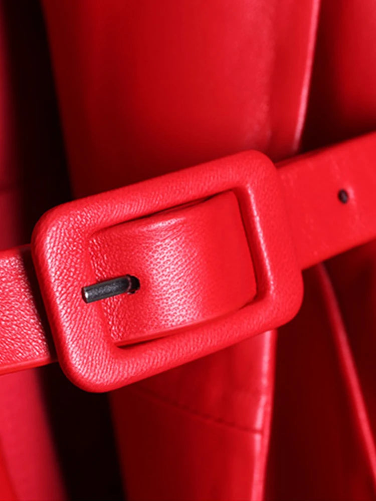 Ilgas raudonas odinis roko stiliaus paltas su diržu
