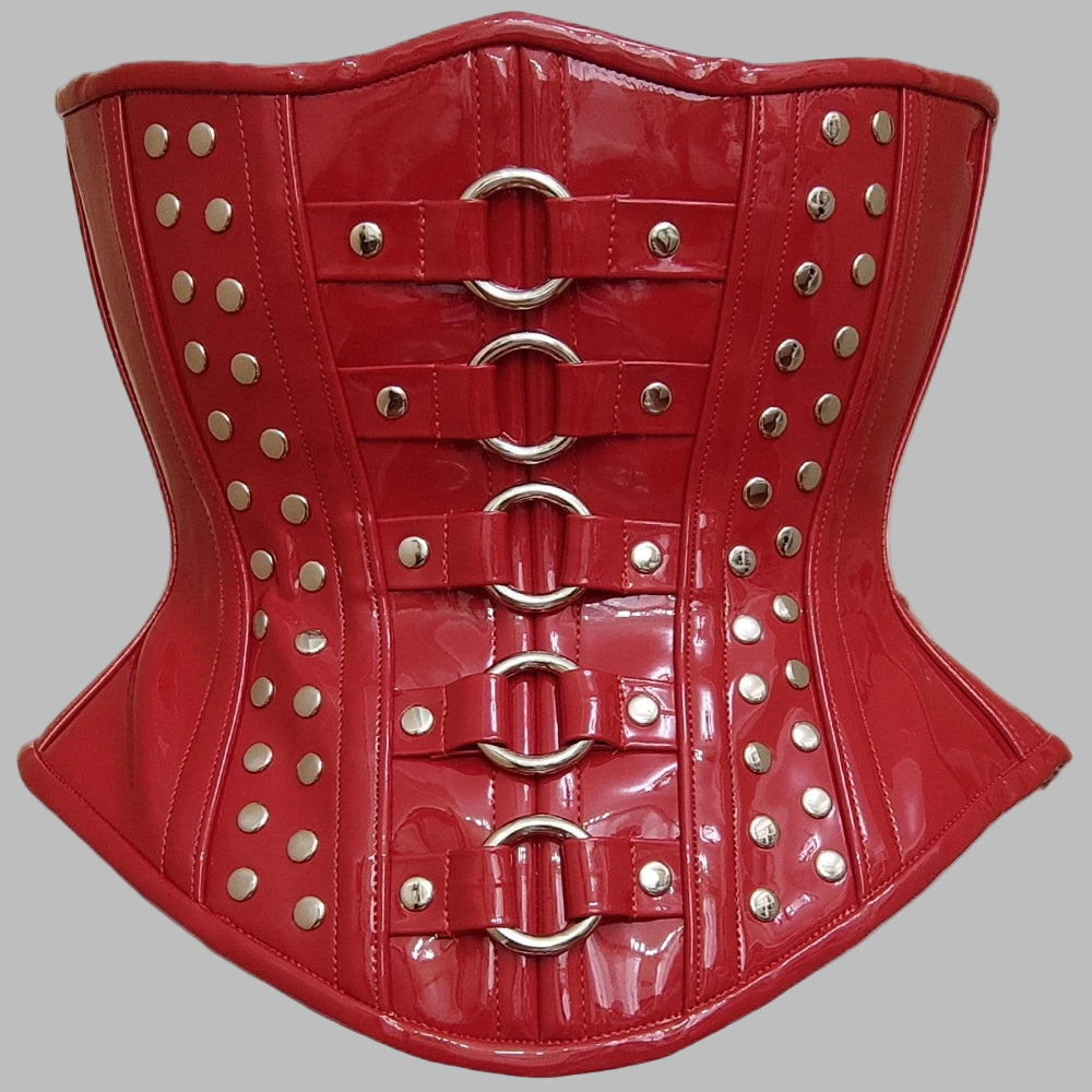 Raudonas punk rock korsetas su kniedėmis ir metaliniais žiedais