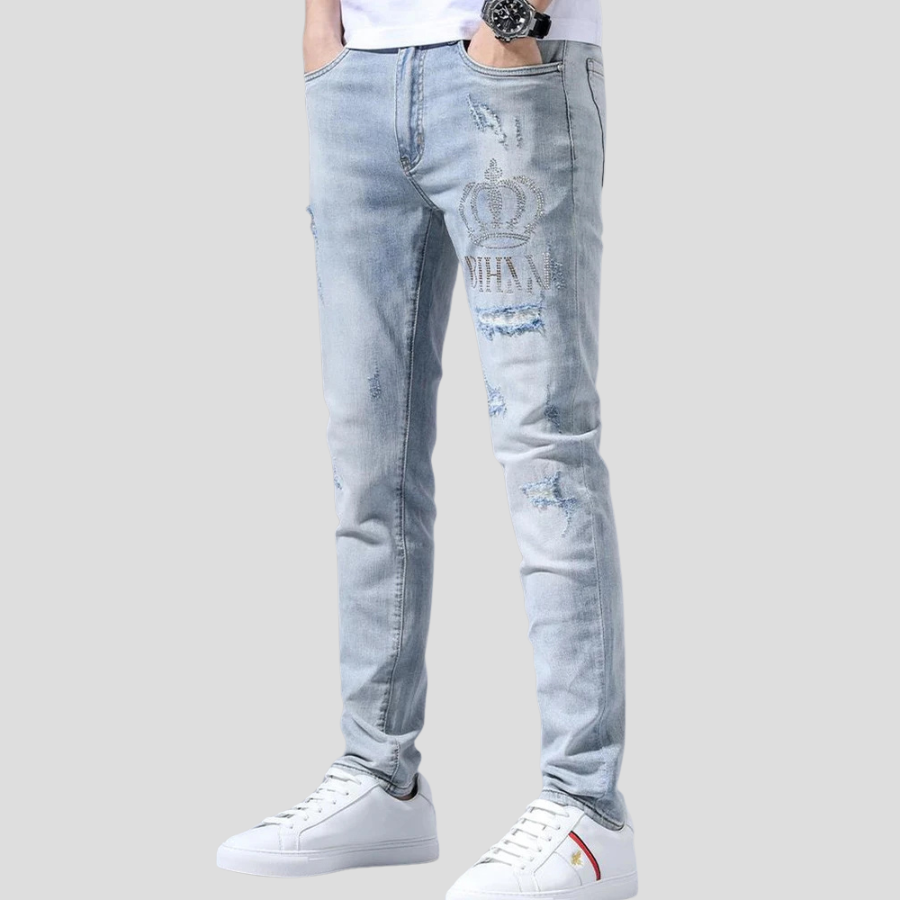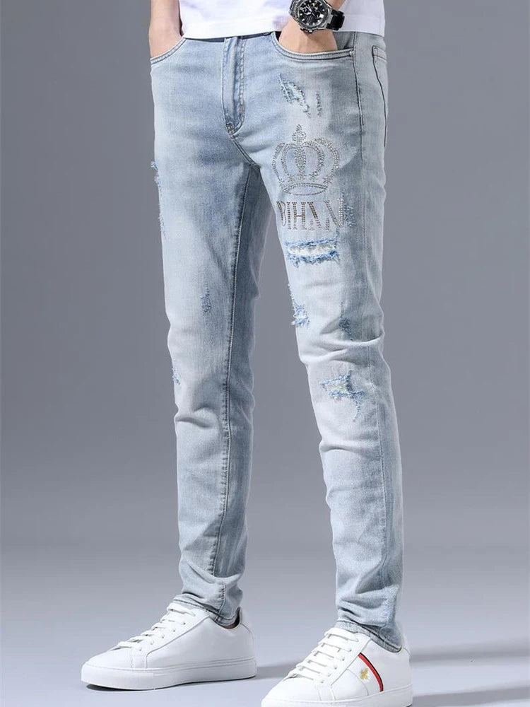 Rock Šviesiai Mėlyni Džinsai su Nusitrynimais ir Karūna