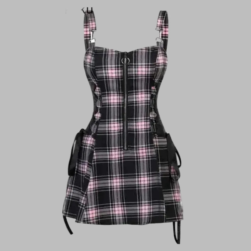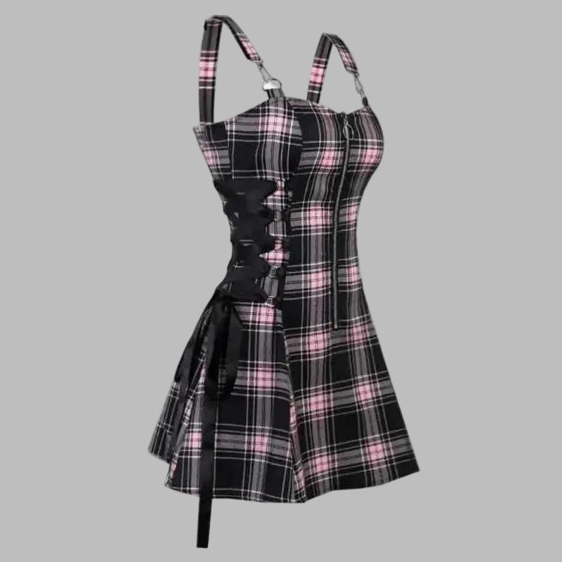 Rožinė languota suknelė su petnešomis ir juostelėmis punk stiliaus