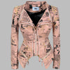 Rožinė punk rock stiliaus odinė striukė su laikraščio spauda