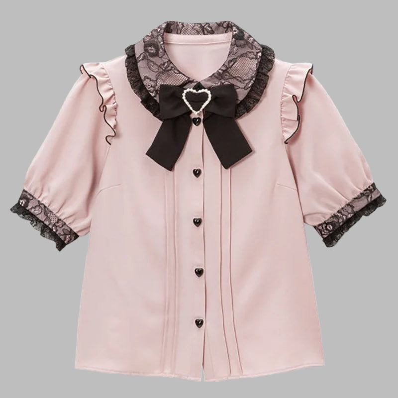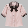 Rožiniai gotikiniai marškinėliai su juodais nėriniais ir dekoratyviniu kaspinu Kawaii Jirai Kei