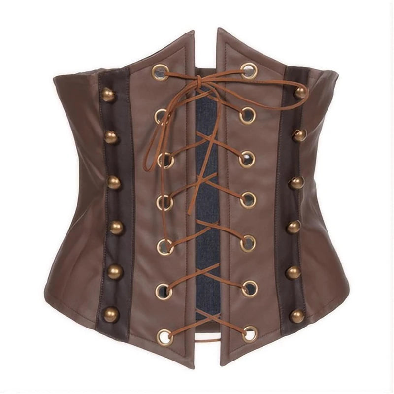 Rudas steampunk odinis korsetas su korseto raišteliais ir sagomis