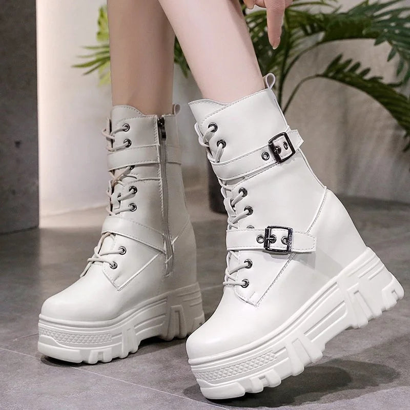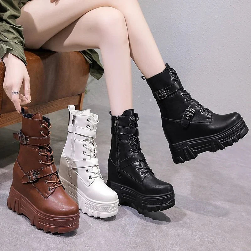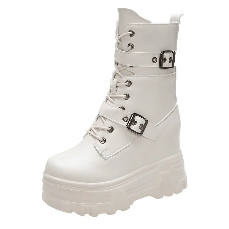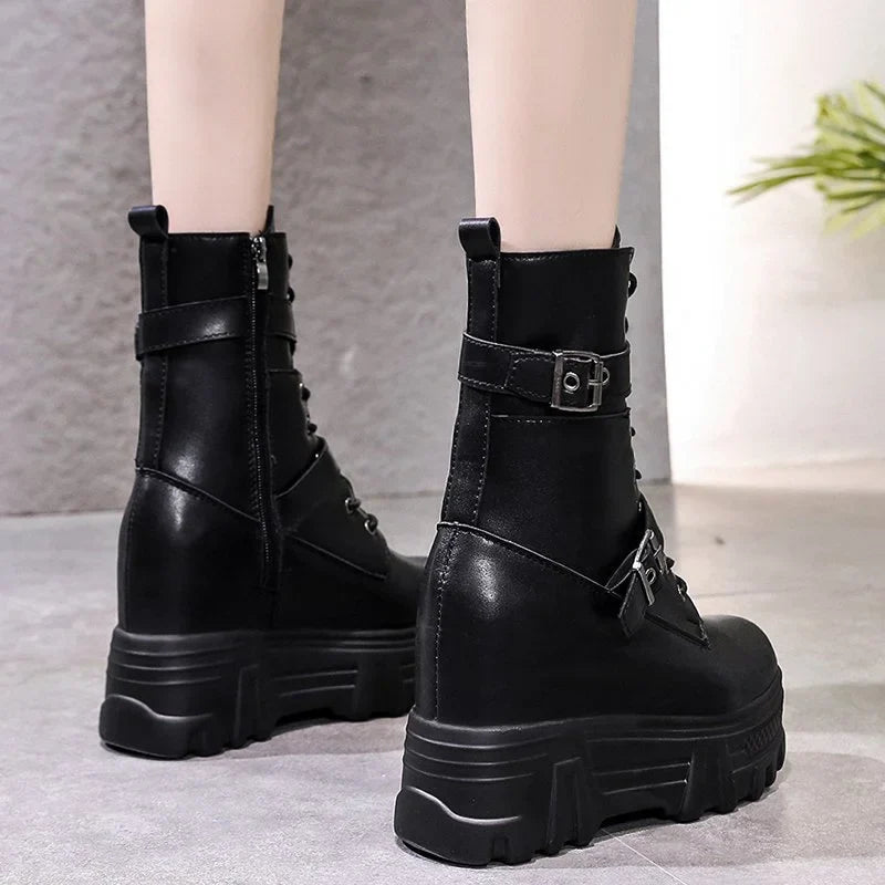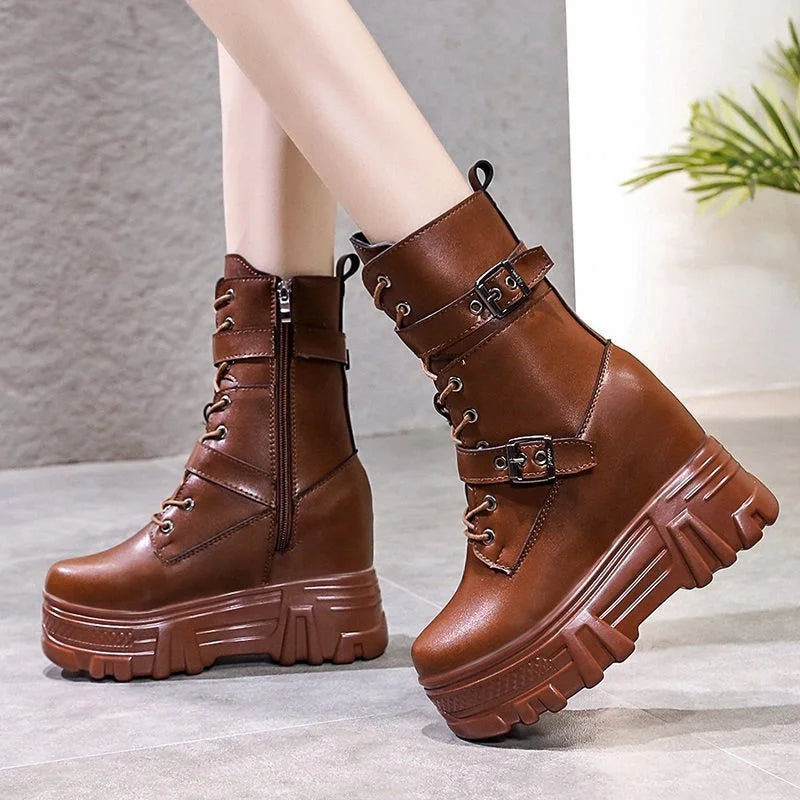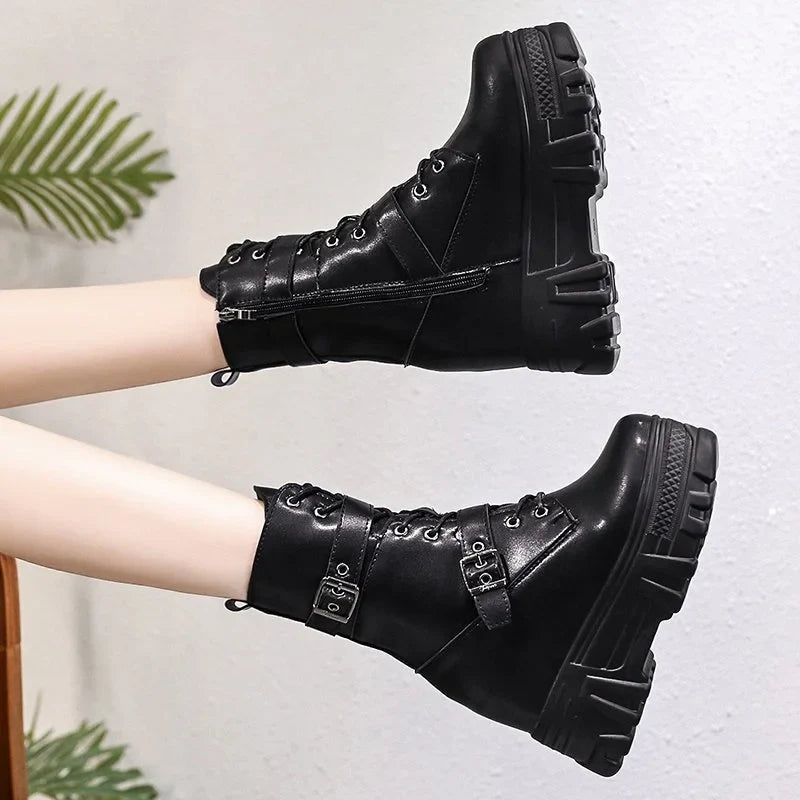 Rudeniniai gotikiniai streetwear stiliaus aulinukai iš dirbtinės odos su raišteliais