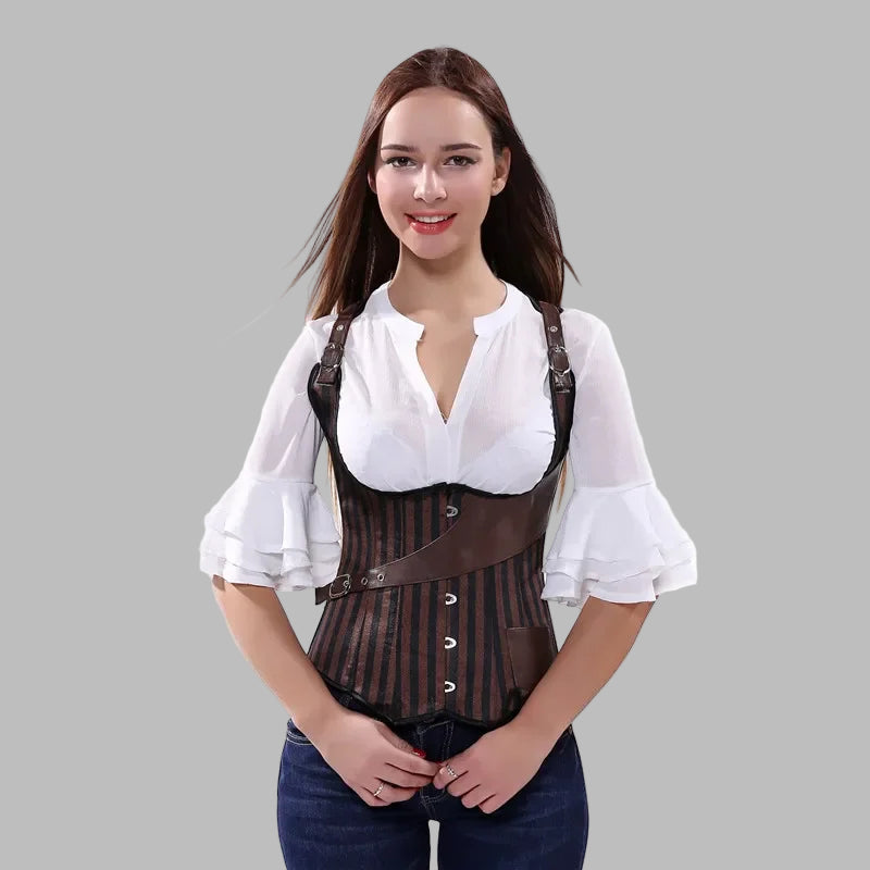 Rudos-juodas dryžuotas steampunk gotikinis korsetas su petnešomis