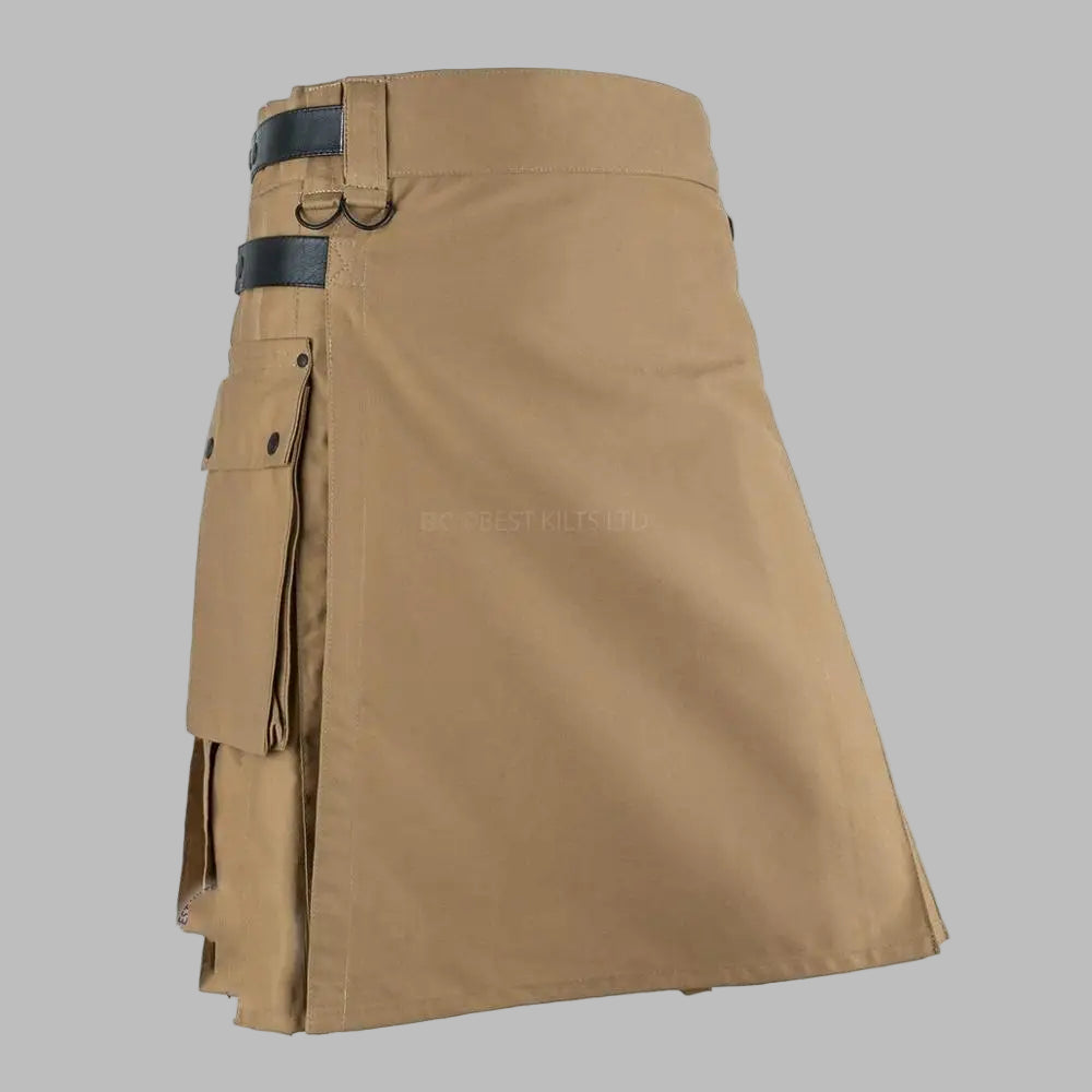 Smėlio spalvos steampunk kiltas su odiniais dirželiais ir sagtimis