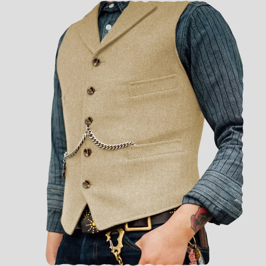Smėlio spalvos steampunk liemenė su kišenine grandinėle eglutės rašto