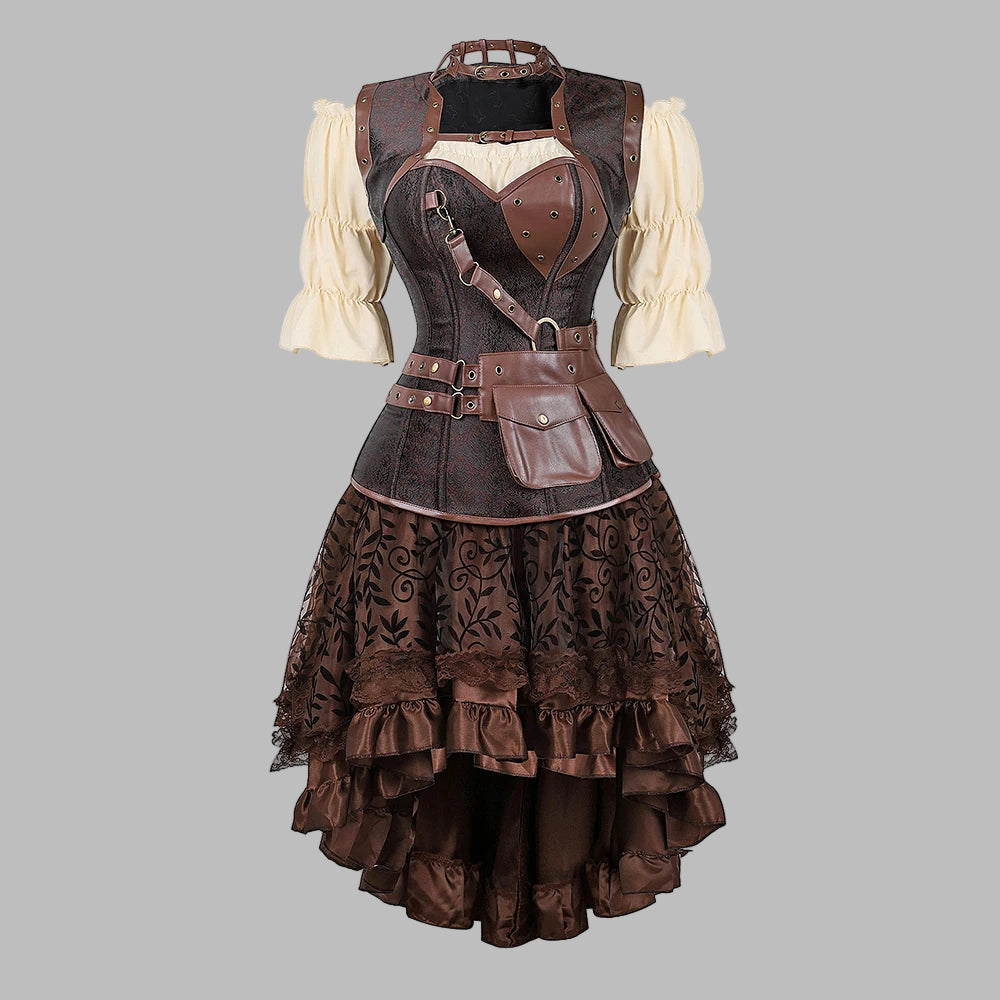Steampunk ruda suknelė su korsetu, dirželiais ir kišenėmis Peržiūrėti parinktis