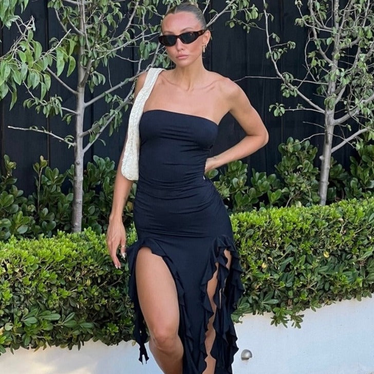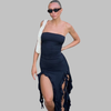 • Jausmingos Detalės: Apgaubiantis biustas, be petnešėlių iškirptė ir raukiniai suteikia šiai suknelei jausmingumo ir originalumo, sukurdami harmoningą pusiausvyrą tarp viliojimo ir elegancijos.