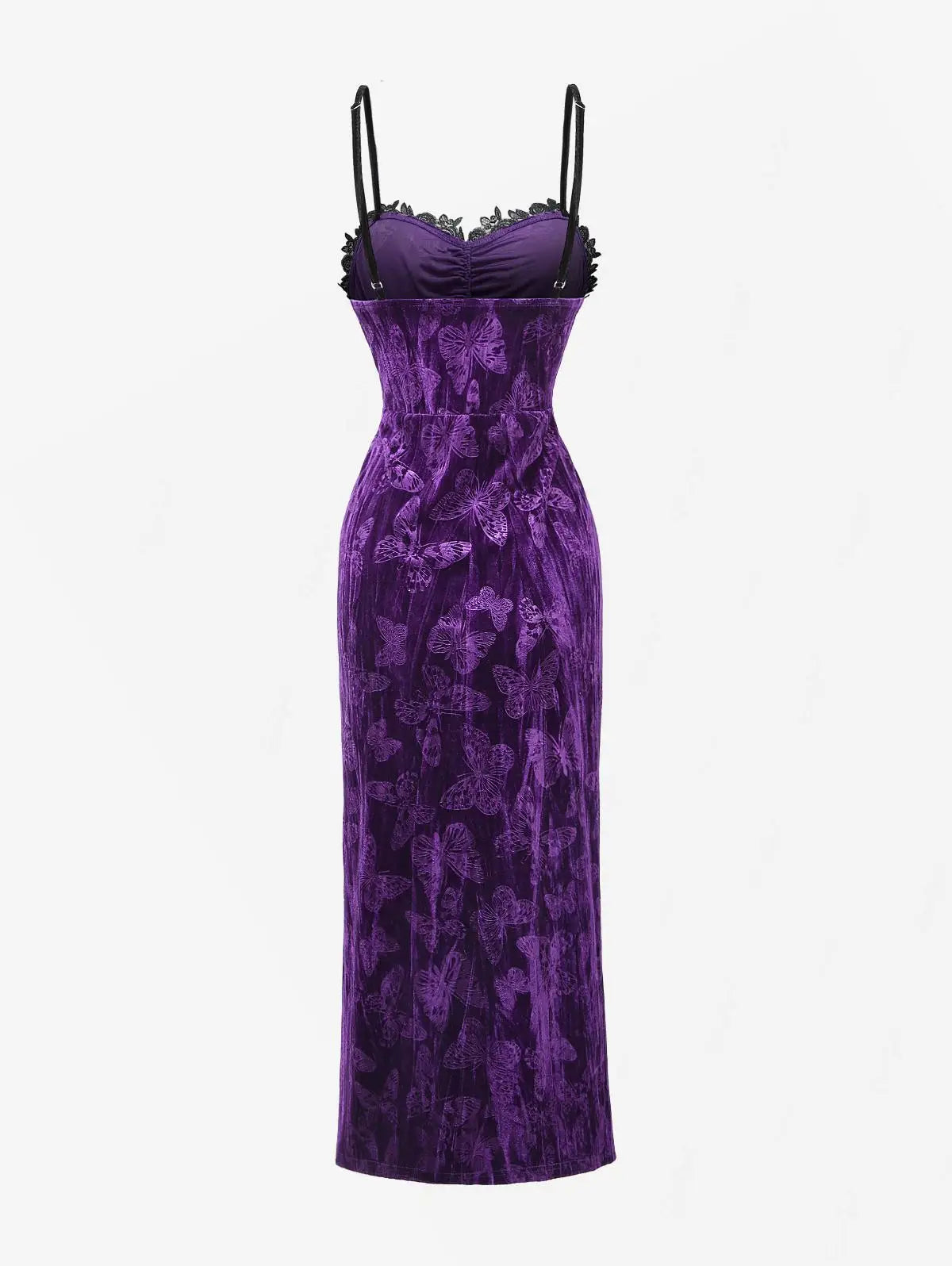 Violetinė ilga gotikinė aksominė suknelė su nėriniais ir kryžiais