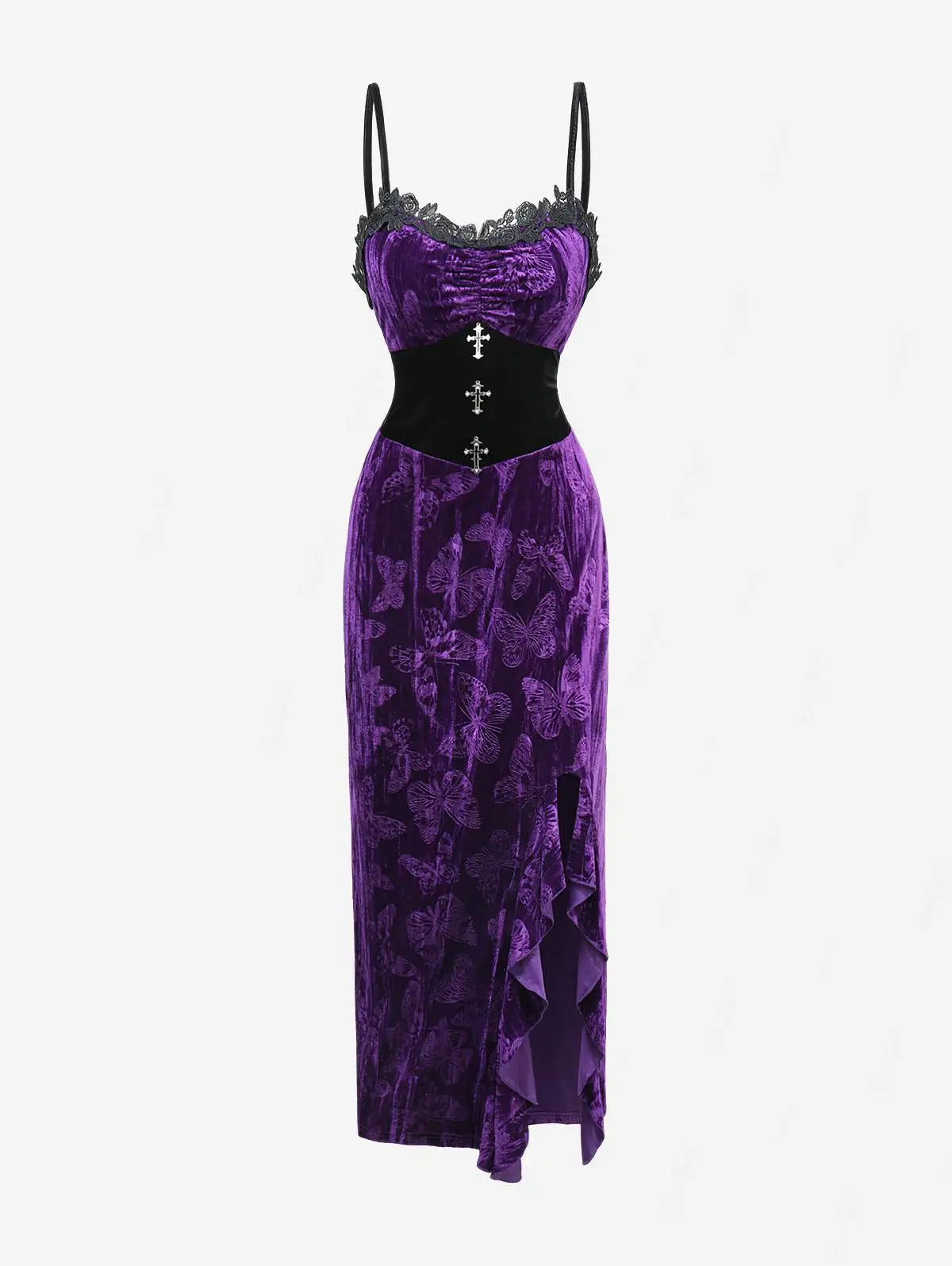 Ilga violetinė gotikinė aksominė suknelė su nėriniais ir kryžiais