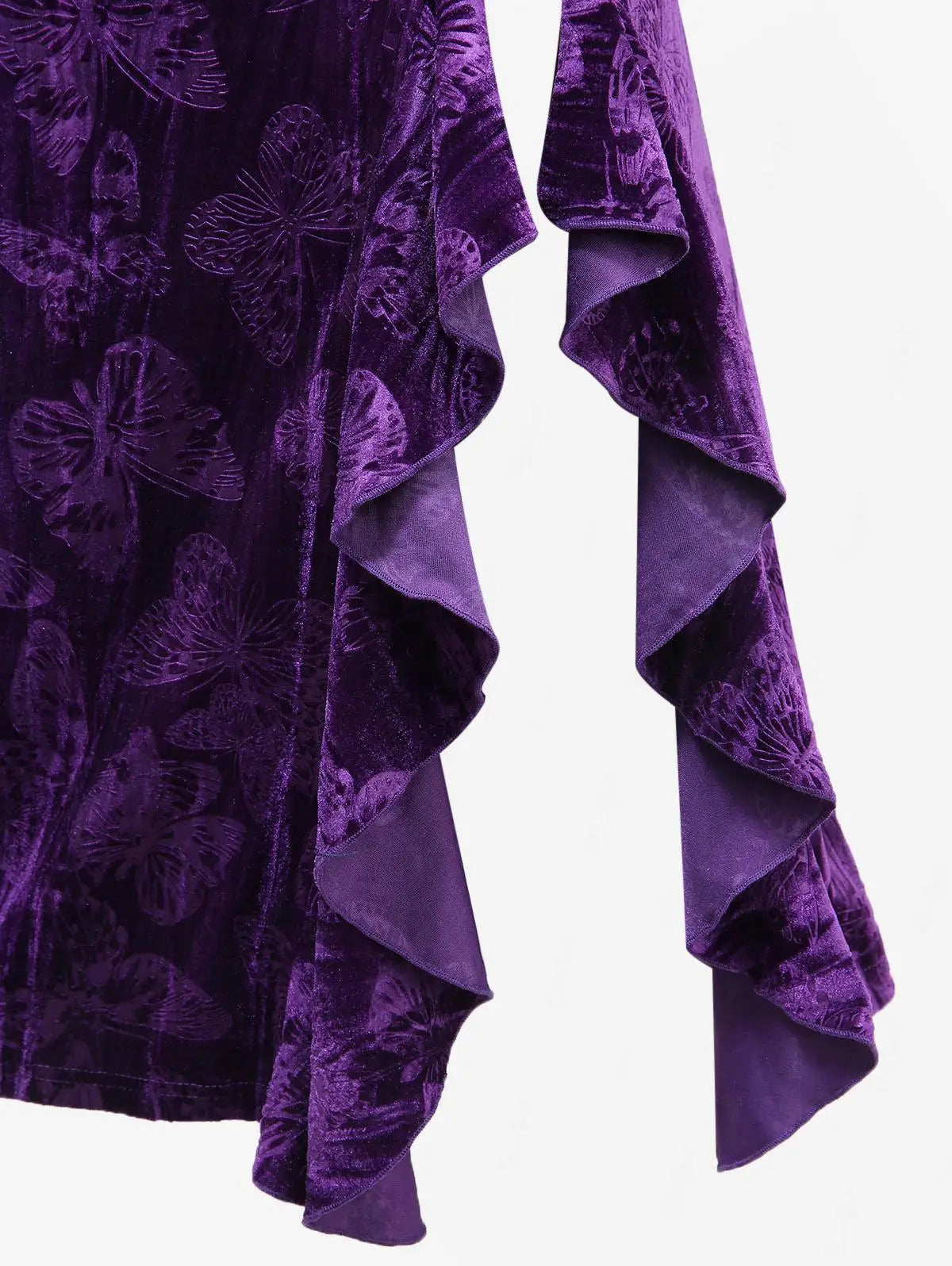 Violetinė aksominė ilga gotikinė suknelė su nėriniais ir kryžiais