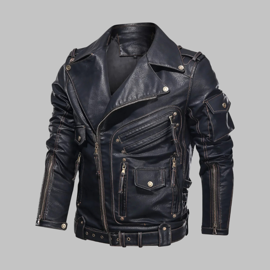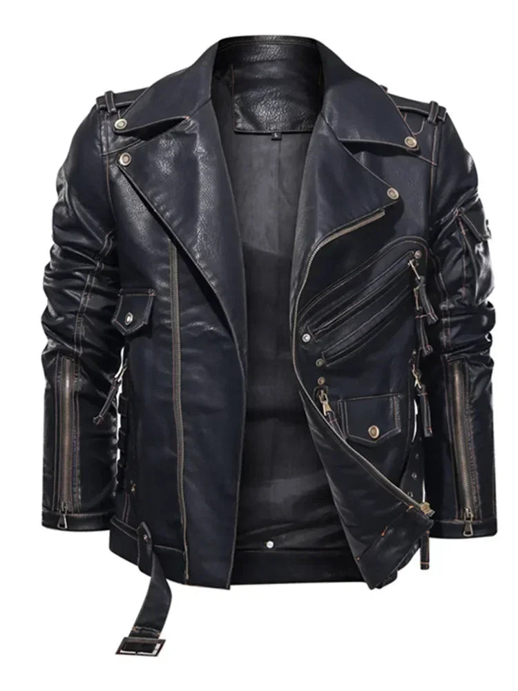 Vyriška juoda motociklinė striukė iš sintetinės odos, roko stiliaus
