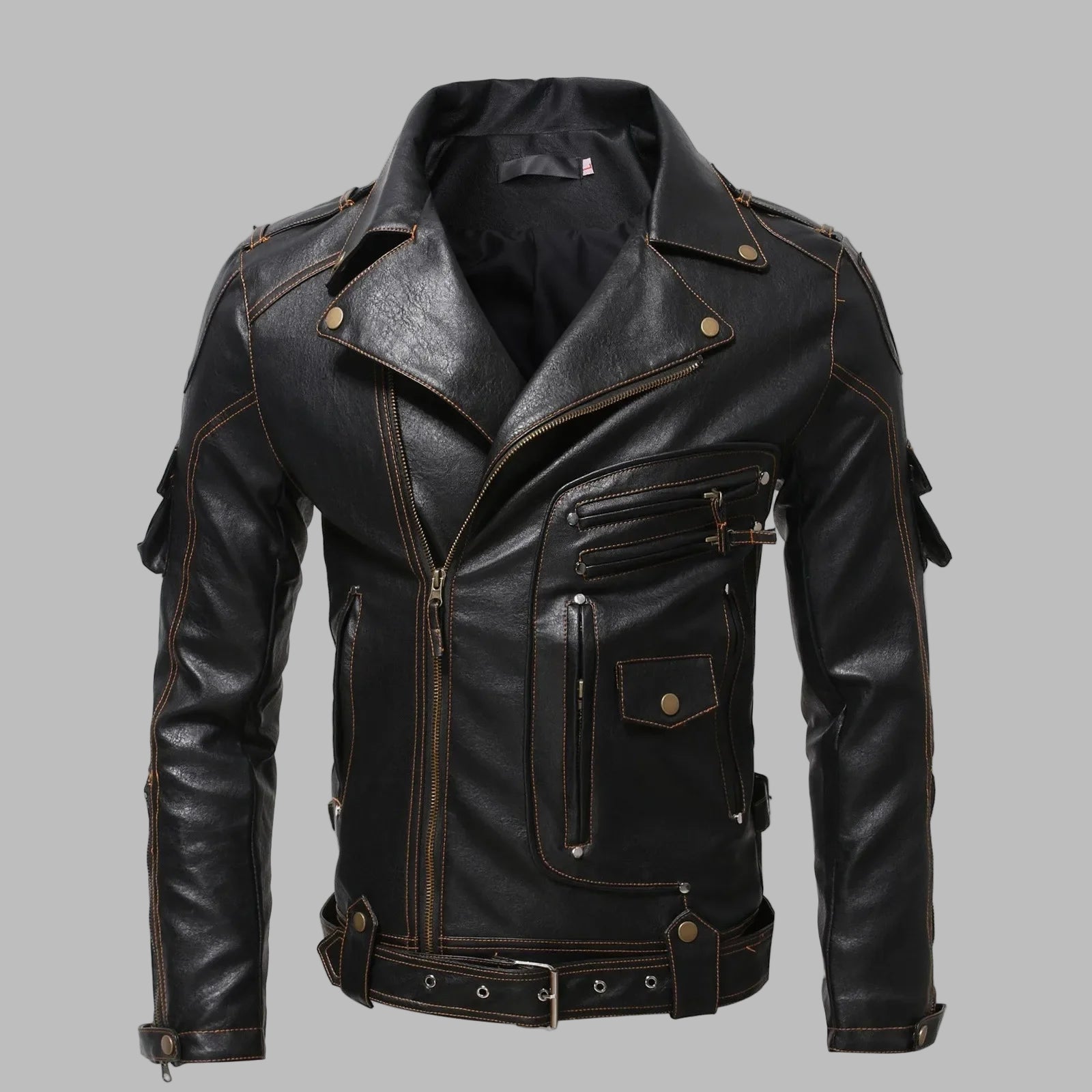 Vyriška juoda odinė motociklinė striukė su kniedėmis ir dirželiais, Goth Punk stiliaus Peržiūrėti parinktis