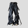 Vyriškos juodos cargo kelnės su užtrauktukais, dirželiais ir kišenėmis, punk techwear stiliaus.