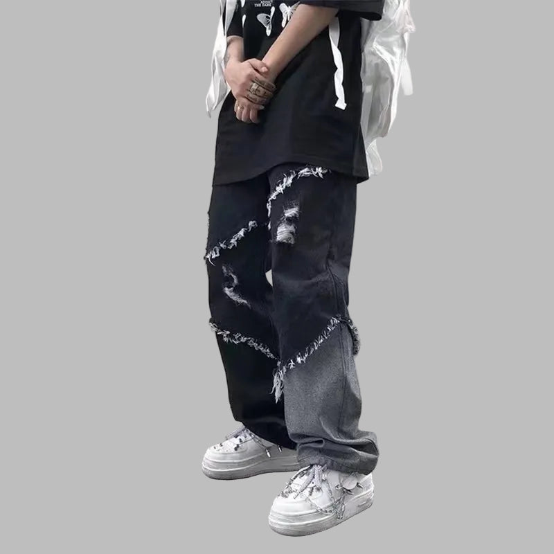 Vyriški juodi pilki grunge stiliaus džinsai su drugelių raštu ir plėšytais elementais