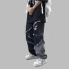 Vyriškos juodos ir pilkos grunge stiliaus džinsinės kelnės su drugelių raštu ir suplėšytais elementais